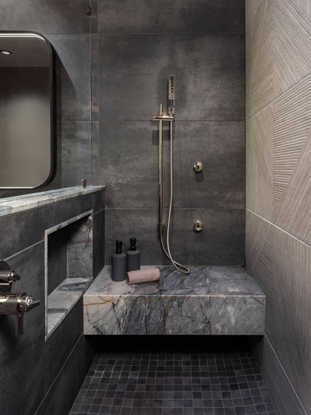 This remodel and furnishing project was designed for a bachelor who wanted a space that reflected his love for Arizona’s canyon landscapes while feeling intimate, moody and refined. The ensuite became a key focal point, featuring deep, rich color drenching, mixed wood textures and a custom vanity. Warm and cool tones balance the space, while carefully integrated lighting enhances depth and atmosphere. Functionality was just as important as aesthetics. Custom-height vanities and mirrors were tailored for a more ergonomic fit, ensuring everyday comfort without compromising style. Thoughtful material choices—matte finishes, textured woods and natural stone—add a tactile, grounded quality to the space. The result is a sleek yet inviting retreat, designed for both relaxation and efficiency.